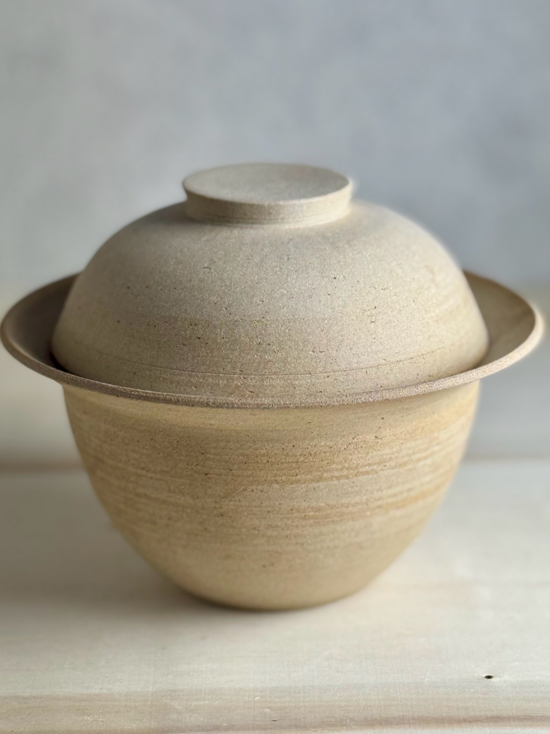 This two piece set made up of a rimmed main bowl with lid which also serves as a second bowl