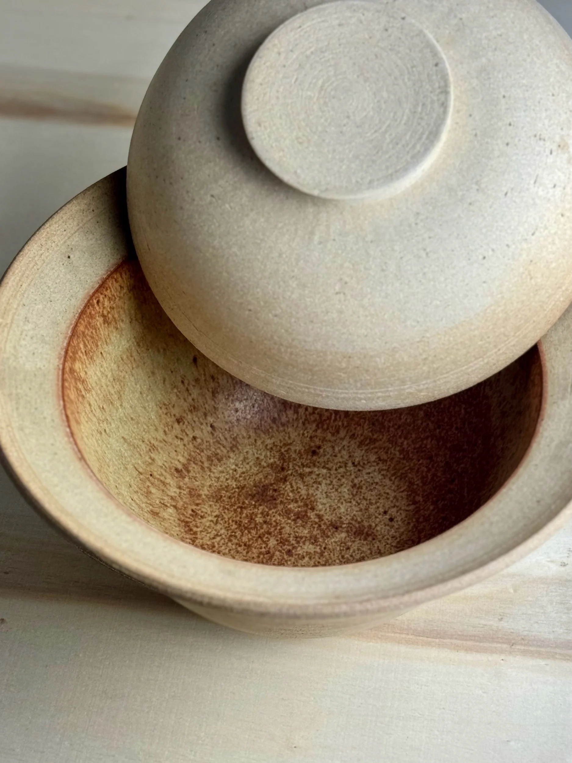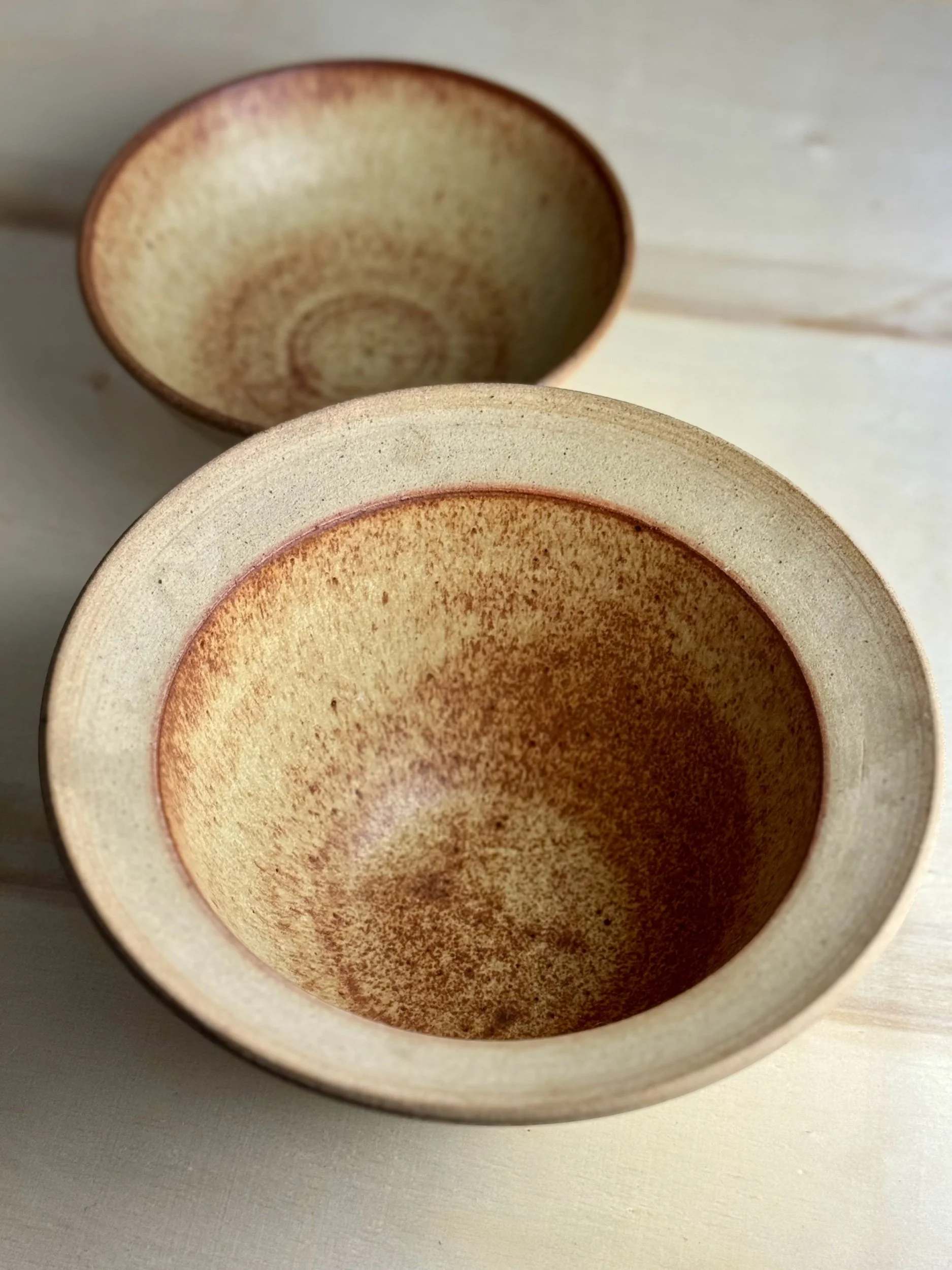 Handmade in a toasty speckled clay and glazed internally in an ochre glaze. Unglazed exterior.