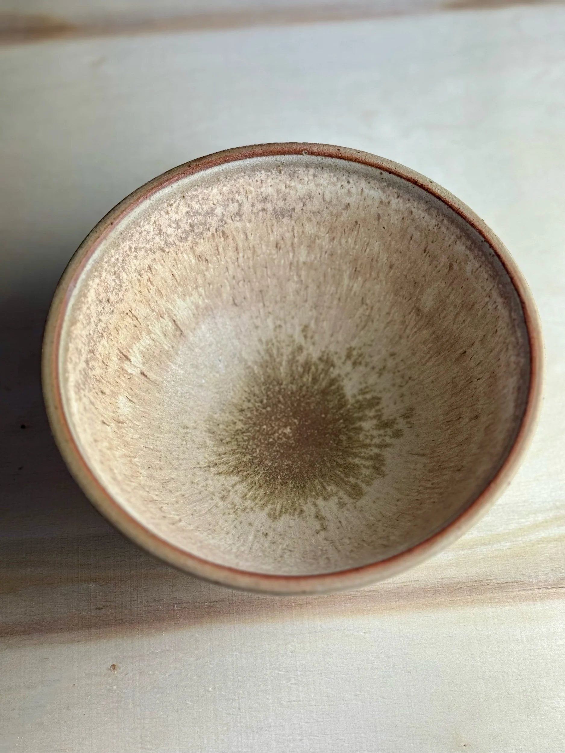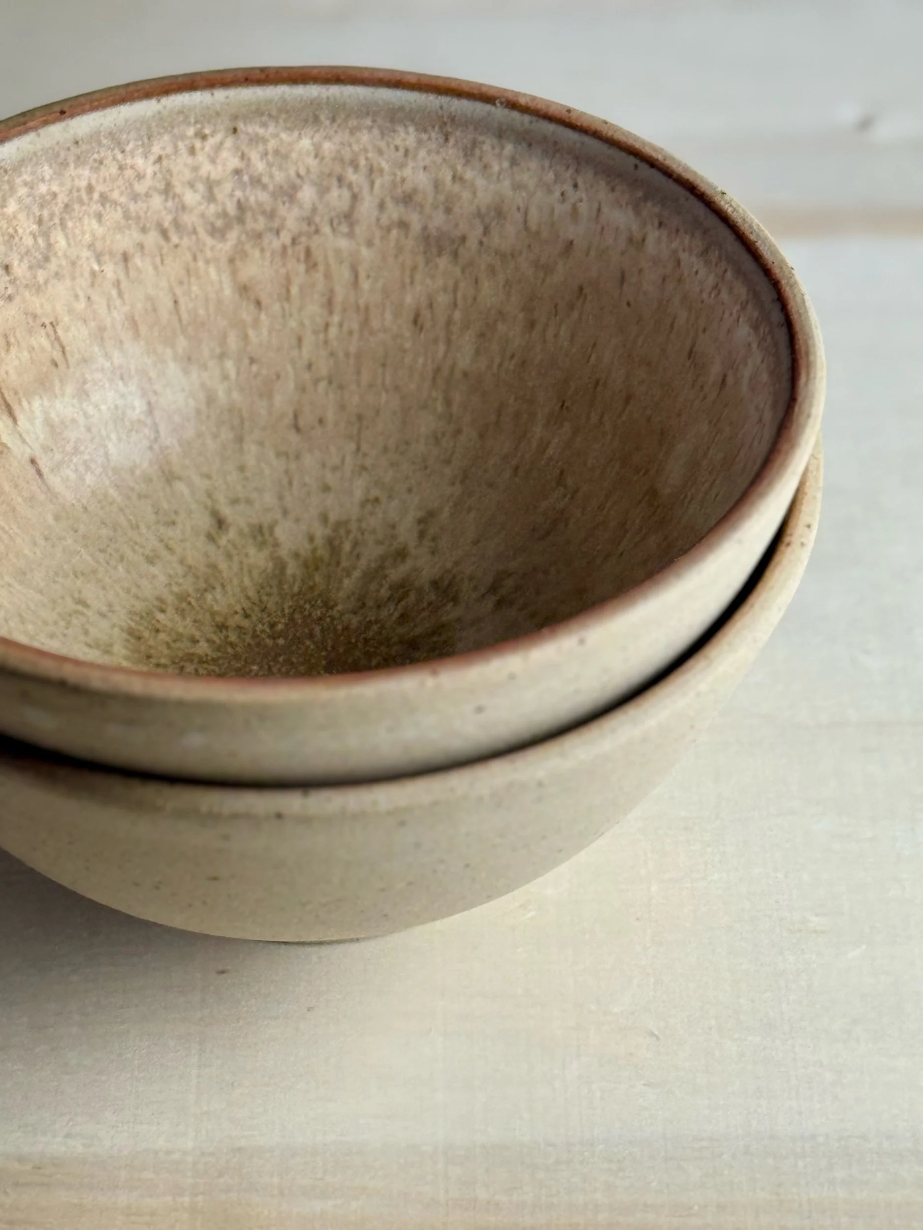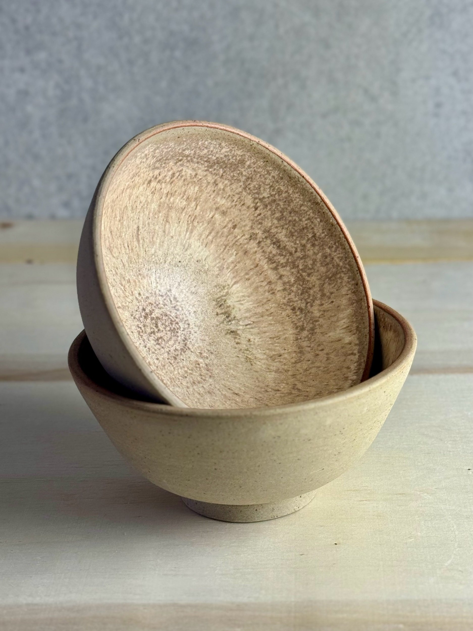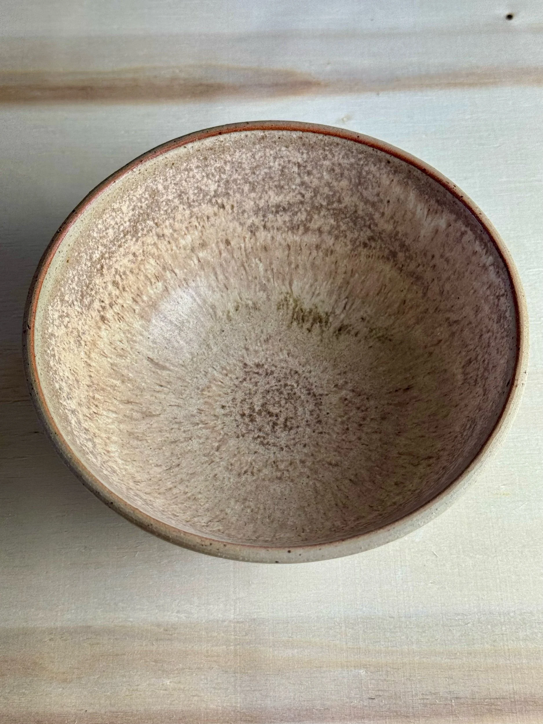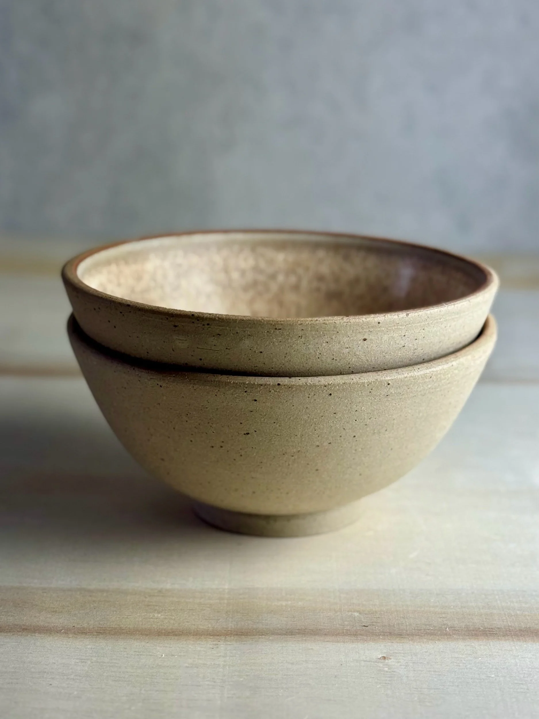 Handmade in a toasty speckled clay and glazed in a satin/matte speckled oatmeal glaze. Unglazed exterior.