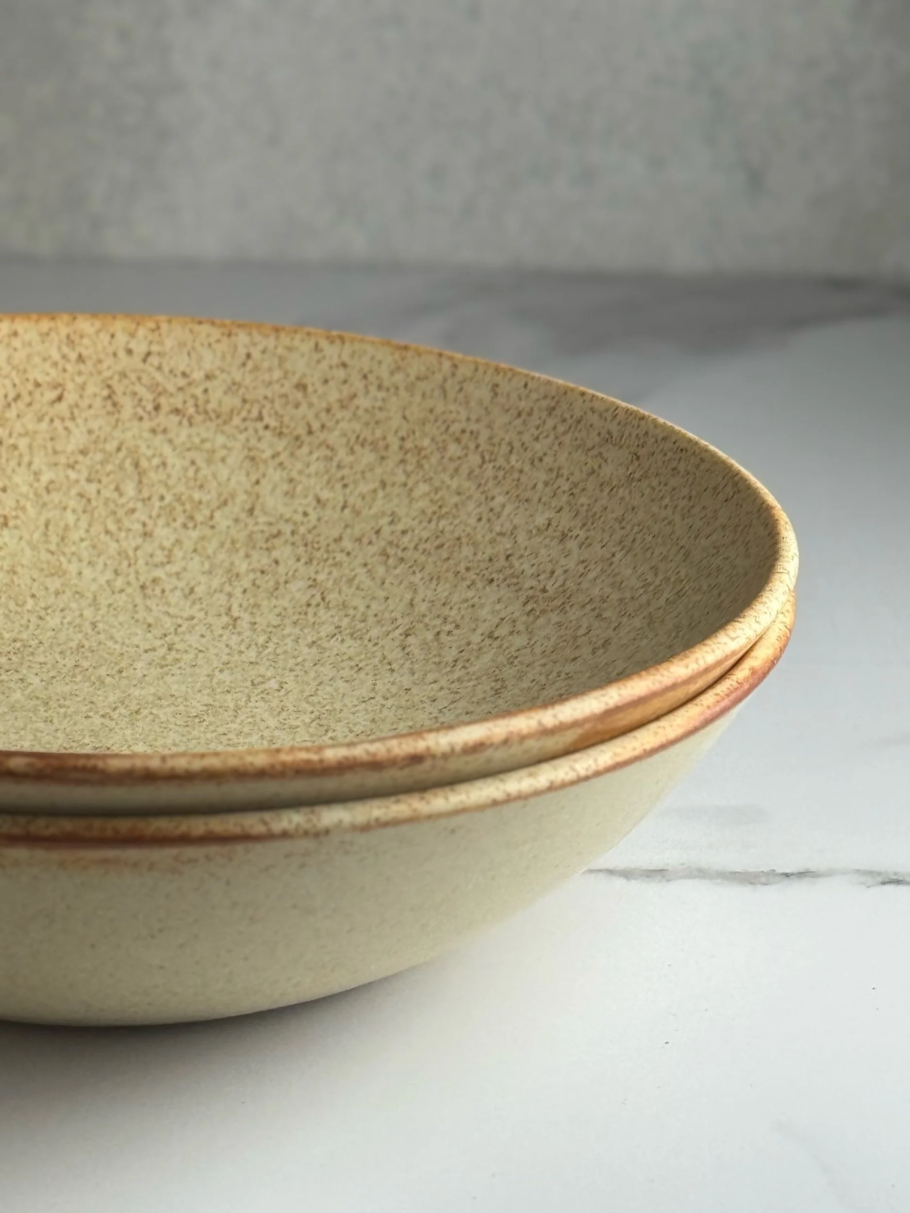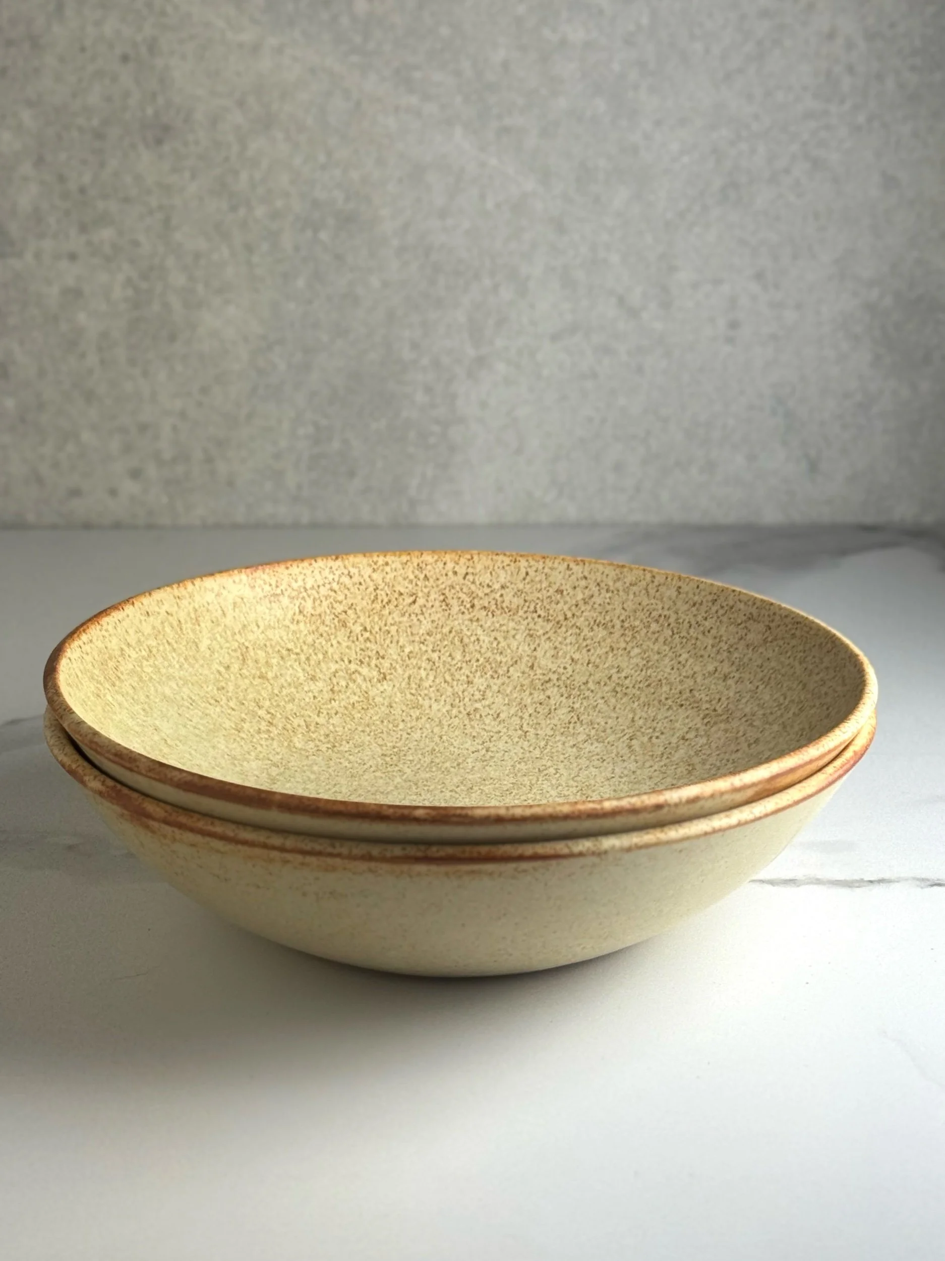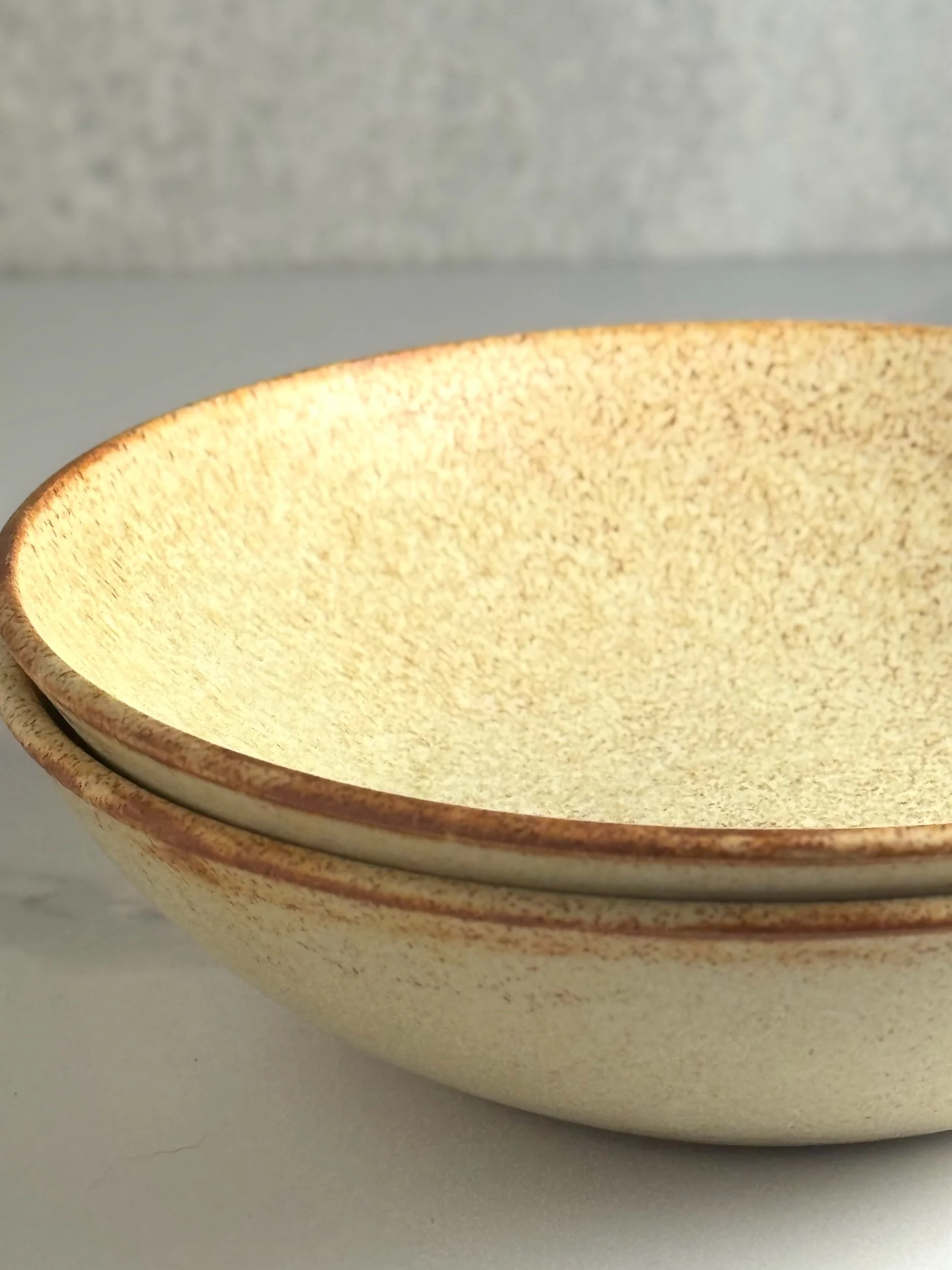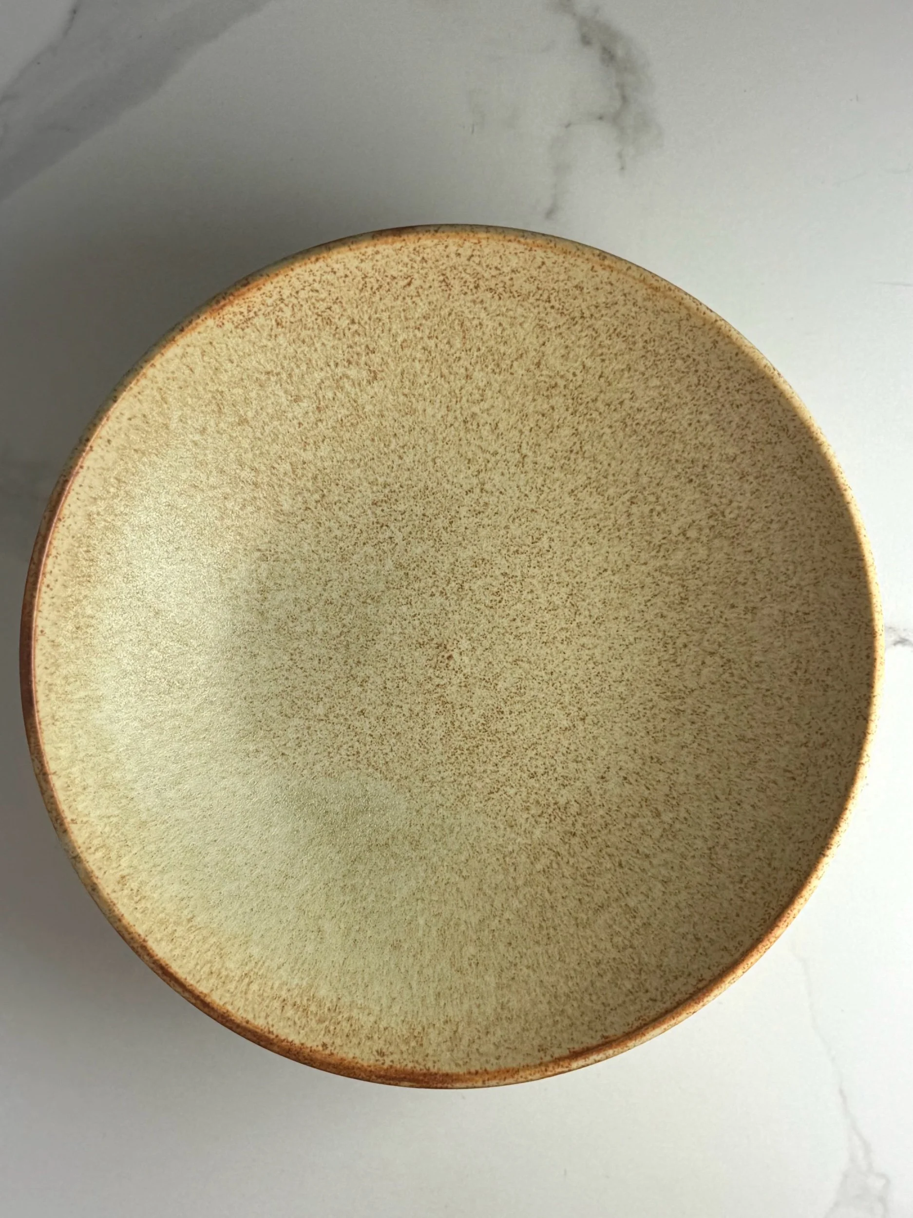 Thrown in a white stoneware clay and glazed with a light ochre glaze inside and out.